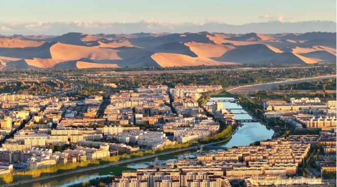 黨河蜿蜒流淌,穿過城市