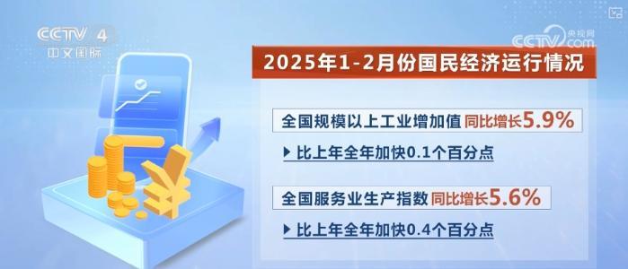 數(shù)據(jù)顯示,2025年1—2月份,工業(yè)生產(chǎn)較快增長,全國規(guī)模以上工業(yè)增加值同比增長5.9%,比上年全年加快0.1個百分點。服務業(yè)增勢較好,全國服務業(yè)生產(chǎn)指數(shù)同比增長5.6%,比上年全年加快0.4個百分點。市場銷售增長加快,社會消費品零售總額83731億元,同比增長4.0%,比上年全年加快0.5個百分點。