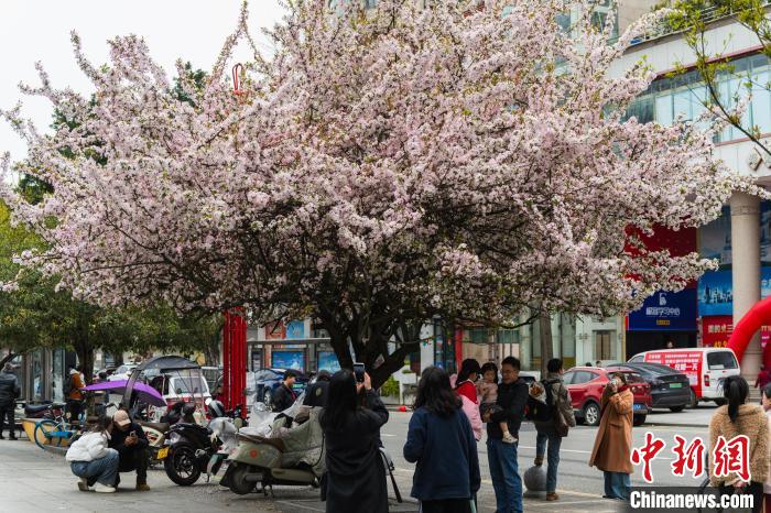 圖為3月16日,棠湖公園正大門處,垂絲海棠盛開,市民在此拍攝寫真照。韓金雨 攝