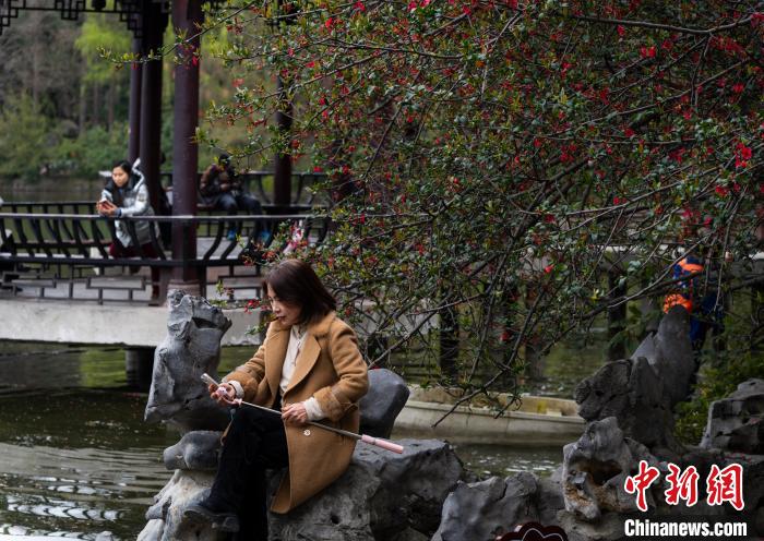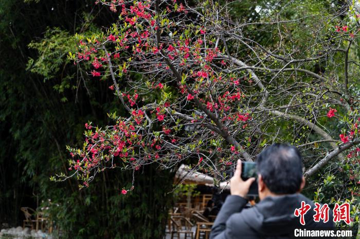 圖為3月16日,市民拍攝棠湖公園內(nèi)的海棠花。韓金雨 攝