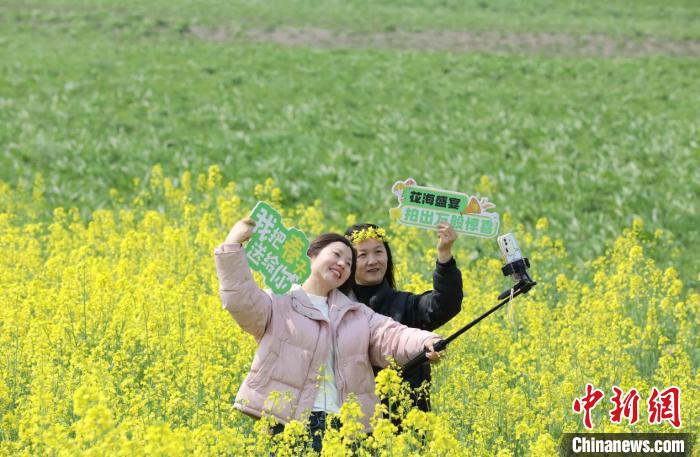 圖為游客在彭澤縣棉船鎮(zhèn)萬畝油菜花田里拍照打卡。彭琴 攝