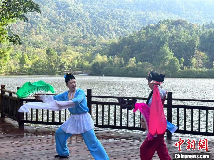 2024年11月,贛南采茶戲演員在江西贛州安遠縣三百山景區(qū)表演采茶戲。(資料圖)安遠縣采茶戲保護傳承中心 供圖
