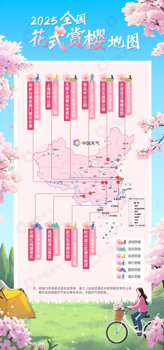 從中國(guó)天氣網(wǎng)推出的2025全國(guó)花式賞櫻地圖來(lái)看,3月初櫻花花事已開(kāi)啟,截至目前長(zhǎng)江以南地區(qū)的櫻花已陸續(xù)迎來(lái)盛花期,北方3月底至4月初也將陸續(xù)進(jìn)入櫻花觀賞期。櫻花季如期而至,賞櫻方式愈發(fā)多元。傳統(tǒng)的游湖、登高、漫步賞櫻依舊備受青睞,夜游、騎行、露營(yíng)等賞櫻方式也各具特色,成為人們賞櫻的新選擇。