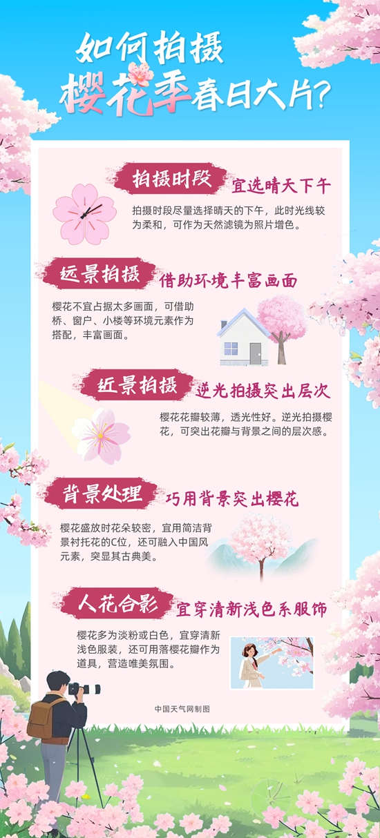 櫻花盛放燦若云霞,但花季卻十分短暫,拍照是留住櫻花之美的絕佳方法之一。如何捕捉櫻花的層次感?人花合影如何營(yíng)造浪漫氛圍感?中國(guó)天氣網(wǎng)從景別、構(gòu)圖、拍攝時(shí)段等方面總結(jié)了拍攝小貼士,助你拍出絕美春日大片。