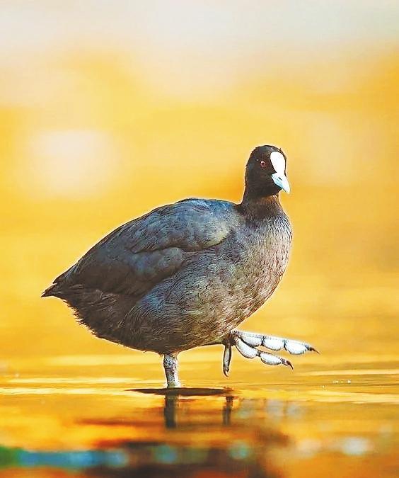 白骨頂又被喚作骨頂雞,卻是鶴類的遠(yuǎn)親。它靜浮水面時(shí),額前一抹象牙白,宛若遺落人間的墨玉鎮(zhèn)紙。這枚額甲實(shí)為特化的角質(zhì)層,是為了保護(hù)頭部的盔胄。灰白色的瓣蹼如雪地靴般包裹趾間,劃開水藻時(shí)泛起粼粼波光——這身黑羽配雪蹼的穿搭,竟比時(shí)裝周的極簡主義更先鋒。當(dāng)它們列隊(duì)掠過蘆葦蕩,水淼勾勒的剪影里,仿佛在繪制著秋天的信箋。