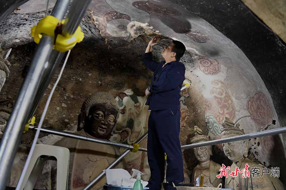 與窟外喧囂不同,在第30窟內(nèi),身著工裝的文物修復(fù)師緊握刀柄、輕刮泥土,讓壁畫和塑像重現(xiàn)昔日光彩。他們用巧手和匠心,靜靜地觸摸著“光陰的故事”。
