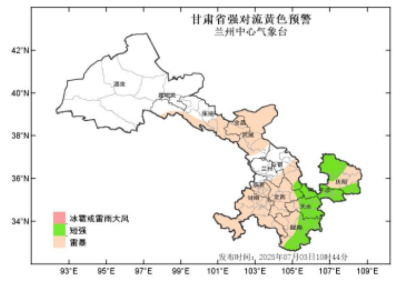 蘭州中心氣象臺(tái)2025年7月3日10時(shí)44分繼續(xù)發(fā)布強(qiáng)對流黃色預(yù)警:預(yù)計(jì)未來24小時(shí),張掖、金昌、武威、蘭州、白銀、甘南、臨夏、定西、隴南、天水、平?jīng)?、慶陽等州市有雷暴,其中隴南、天水、平?jīng)?、慶陽等市部分地方及白銀、定西兩市局部地方有短時(shí)強(qiáng)降水,最大小時(shí)雨強(qiáng)20-60mm;隴南、天水、平?jīng)?、慶陽等市強(qiáng)降水在未來24小時(shí)內(nèi)多發(fā),白銀、定西主要強(qiáng)降水時(shí)段在4日2-8時(shí)。請注意防范!
