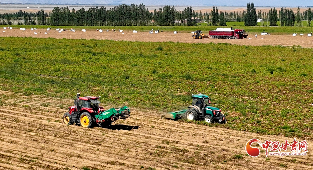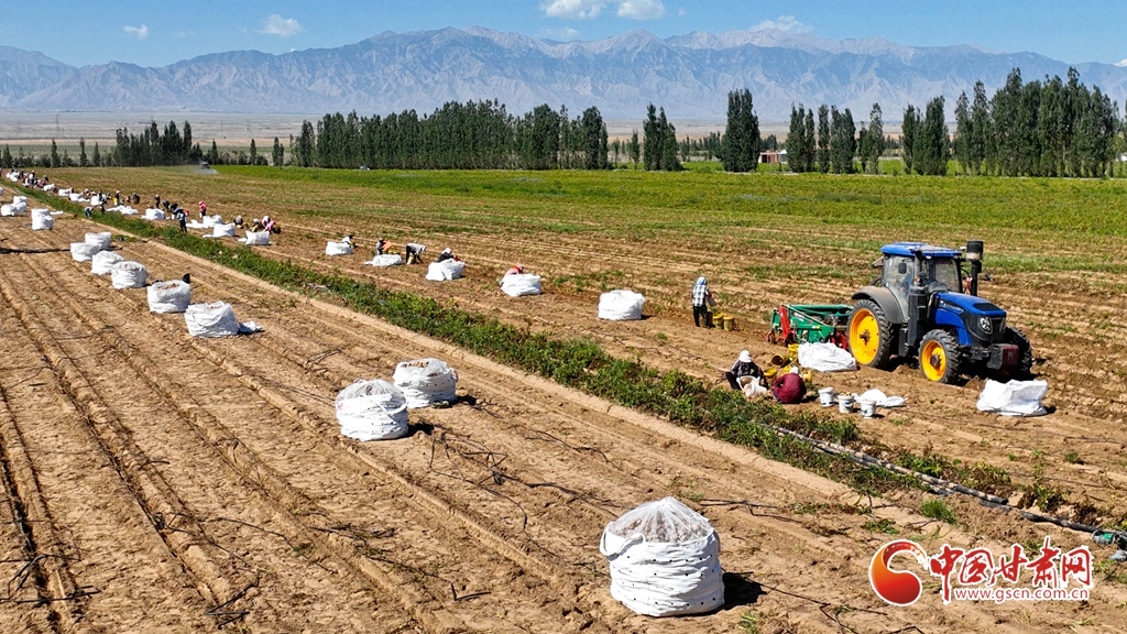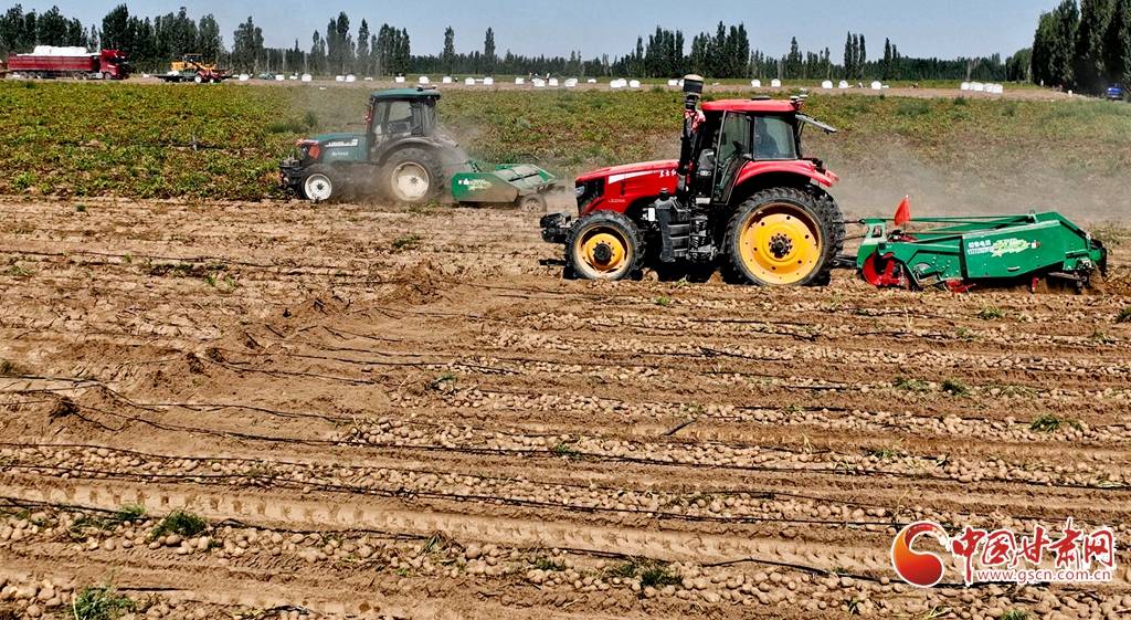 8月14日,祁連山下的張掖市高臺(tái)縣新壩鎮(zhèn)馬鈴薯種植基地一片繁忙。收獲機(jī)在田間穿梭,碩大的馬鈴薯破土而出,工人們正加緊進(jìn)行撿拾、分揀和裝車。
