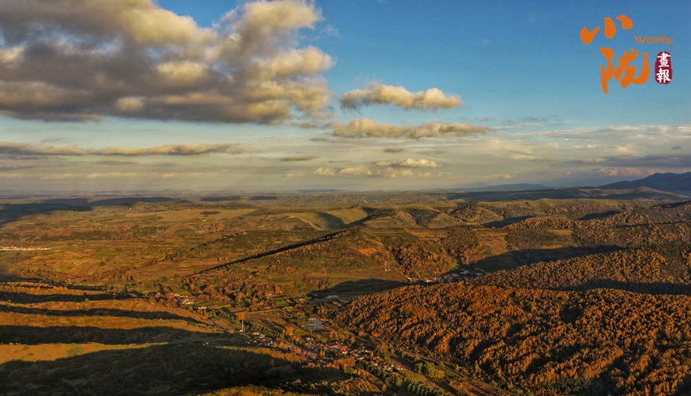 大北山被染成了暖黃色。極目遠(yuǎn)眺,五彩斑斕的山脊,與藍(lán)天、山坳交織在一起,格外溫馨浪漫。漫步其間,宛如行走在金色的油畫里。