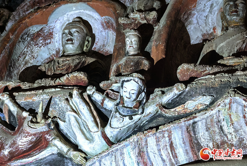 這里最具特色的是東窟一層龕楣兩側(cè)懸塑的飛天,相對作凌空飛舞之勢。金塔寺內(nèi)的高肉雕彩塑飛天歷史遠早于敦煌飛天,屬洞窟藝術之罕見珍品,為全國僅有。
