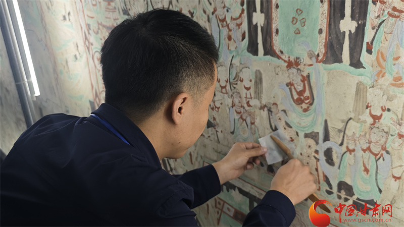 敦煌研究院文物保護技術(shù)服務(wù)中心年輕的文物保護員唐青松有幸成為修復(fù)團隊一員,開啟在敦煌莫高窟修壁畫的時光。