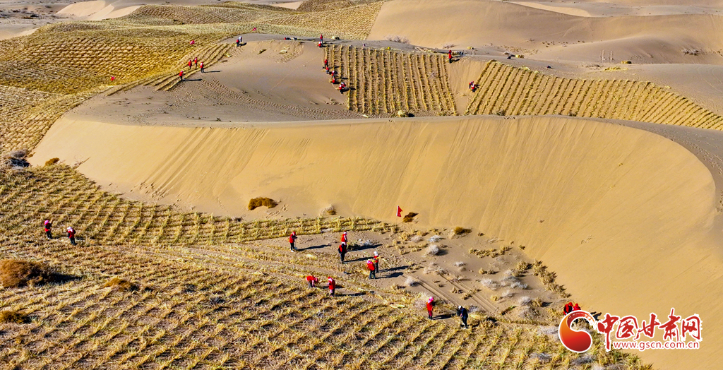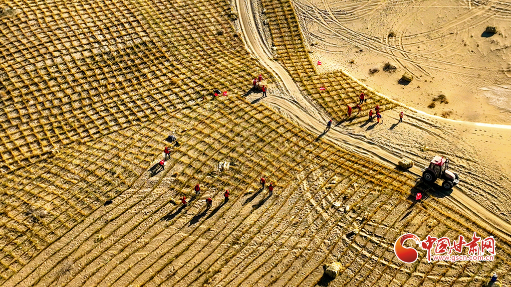 據(jù)了解,明花鄉(xiāng)地處巴丹吉林沙漠邊緣,沙化戈壁面積超過40萬畝,是國家“三北”防護(hù)林體系建設(shè)和北方防沙帶的關(guān)鍵區(qū)域。多年來,當(dāng)?shù)厝罕姵掷m(xù)開展防沙治沙,與危害生態(tài)的“黃龍”展開了一場“人進(jìn)沙退”的持久戰(zhàn)。時下,3.27萬畝“草方格沙障+高立式PE網(wǎng)沙障”沙化土地治理項目正緊鑼密鼓地推進(jìn)實施。