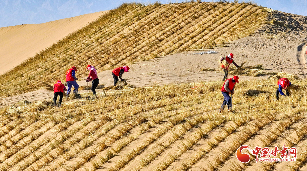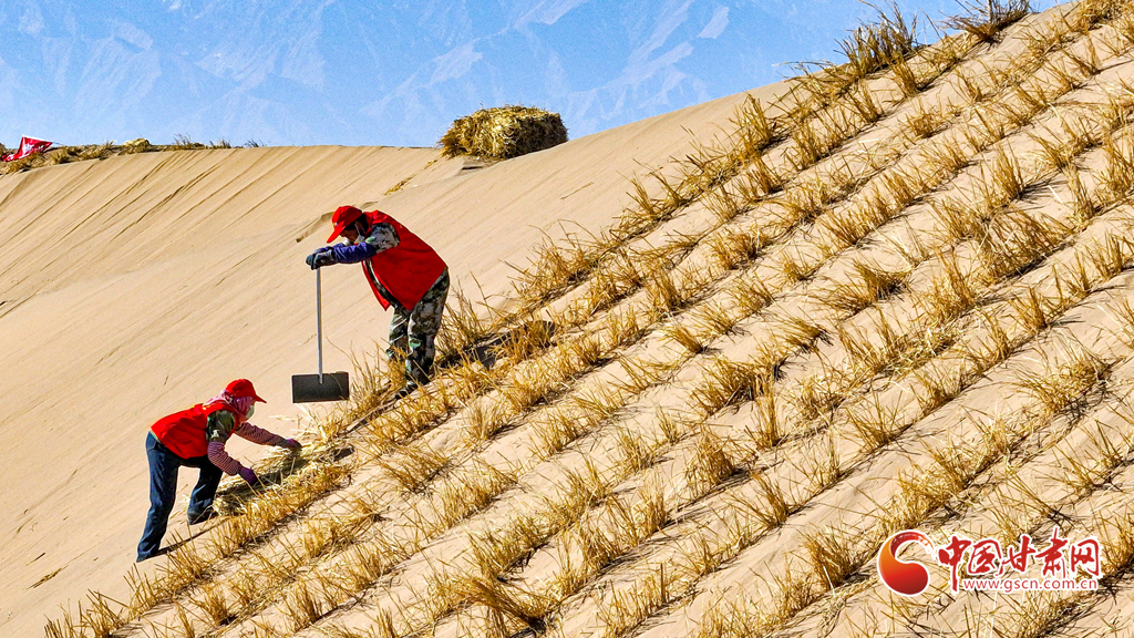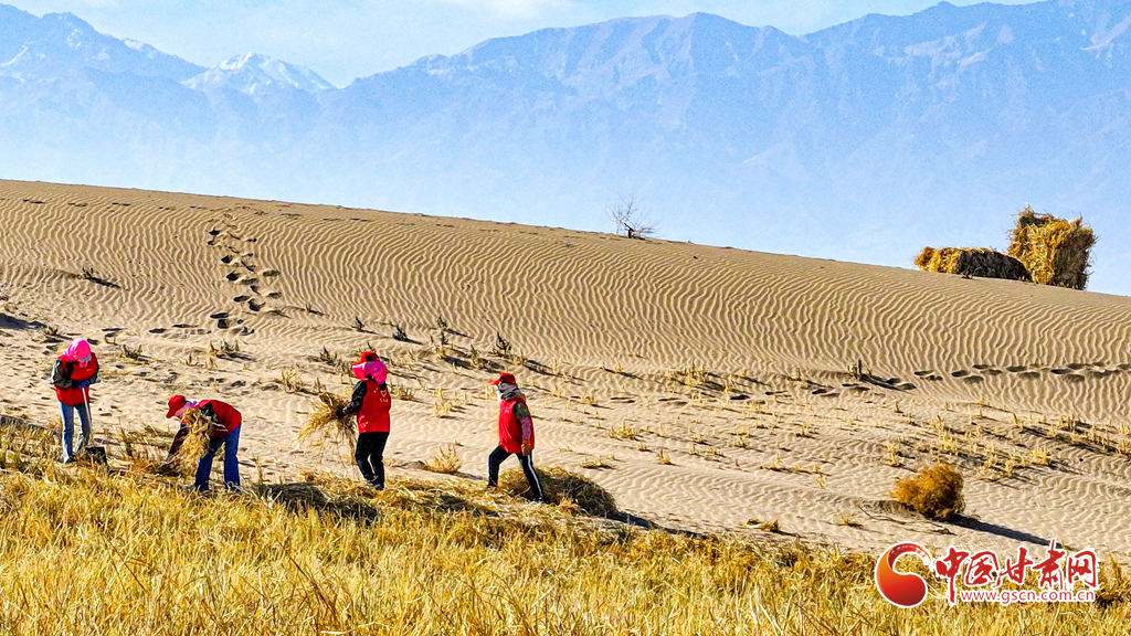 連日來,在張掖市肅南裕固族自治縣明花鄉(xiāng)西南部的干旱荒漠區(qū),運草車輛往復(fù)穿梭,1600余名治沙工人于巴丹吉林沙漠西南緣的沙丘間忙碌作業(yè)。他們劃線、背草、俯身鋪草、揮鍬壓埋,全力營建沙障與固沙林帶,為沙漠牢牢“鎖邊”。