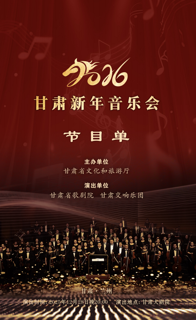 中國甘肅網(wǎng)12月24日訊(西北角·中國甘肅網(wǎng)記者 任磊)2026甘肅新年音樂會(huì)將于12月28日晚在甘肅大劇院奏響。本場音樂會(huì)由甘肅省文化和旅游廳主辦,甘肅省歌劇院、甘肅交響樂團(tuán)承辦,將以一場中西合璧、氣勢(shì)恢宏的交響盛宴,為金城觀眾獻(xiàn)上誠意滿滿的新年祝福。