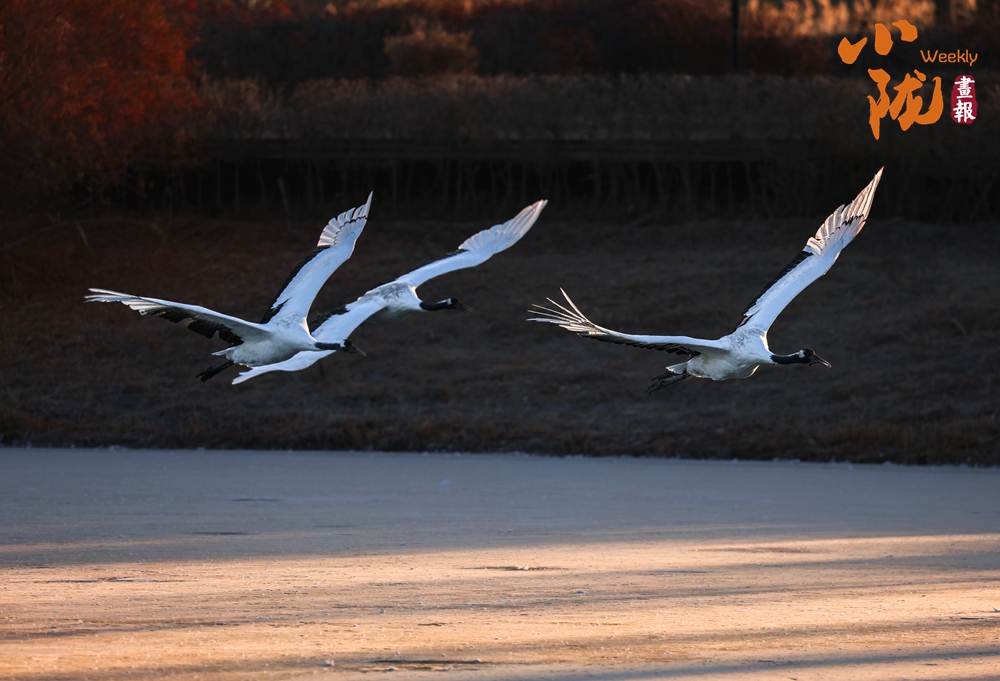 陽光灑在冰面上,晶瑩閃亮。十多只丹頂鶴翩翩起舞,飄逸的飛翔,優(yōu)雅的舞姿,輕盈的腳步,用最純粹的姿態(tài)演繹著生命的禮贊。