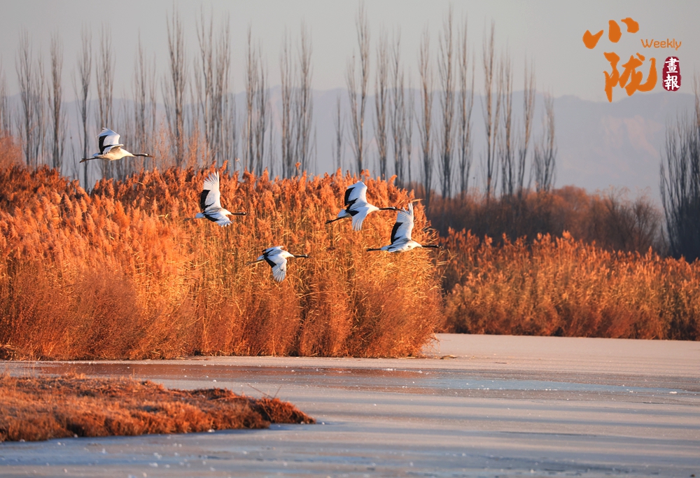 金色的蘆葦坡上均能看到它們優(yōu)雅的身影。這里,除了丹頂鶴,還有天鵝、綠頭鴨、斑頭雁等很多水鳥,它們的倩影成為濕地冬日里最動(dòng)人的靈動(dòng)色彩。